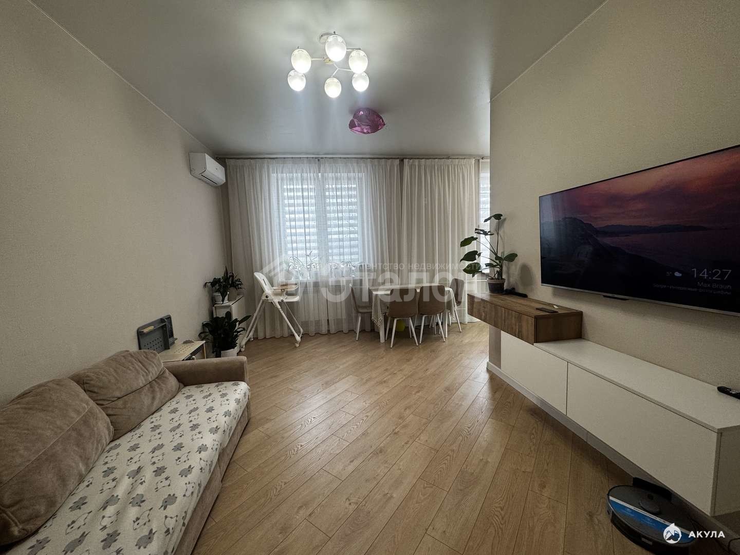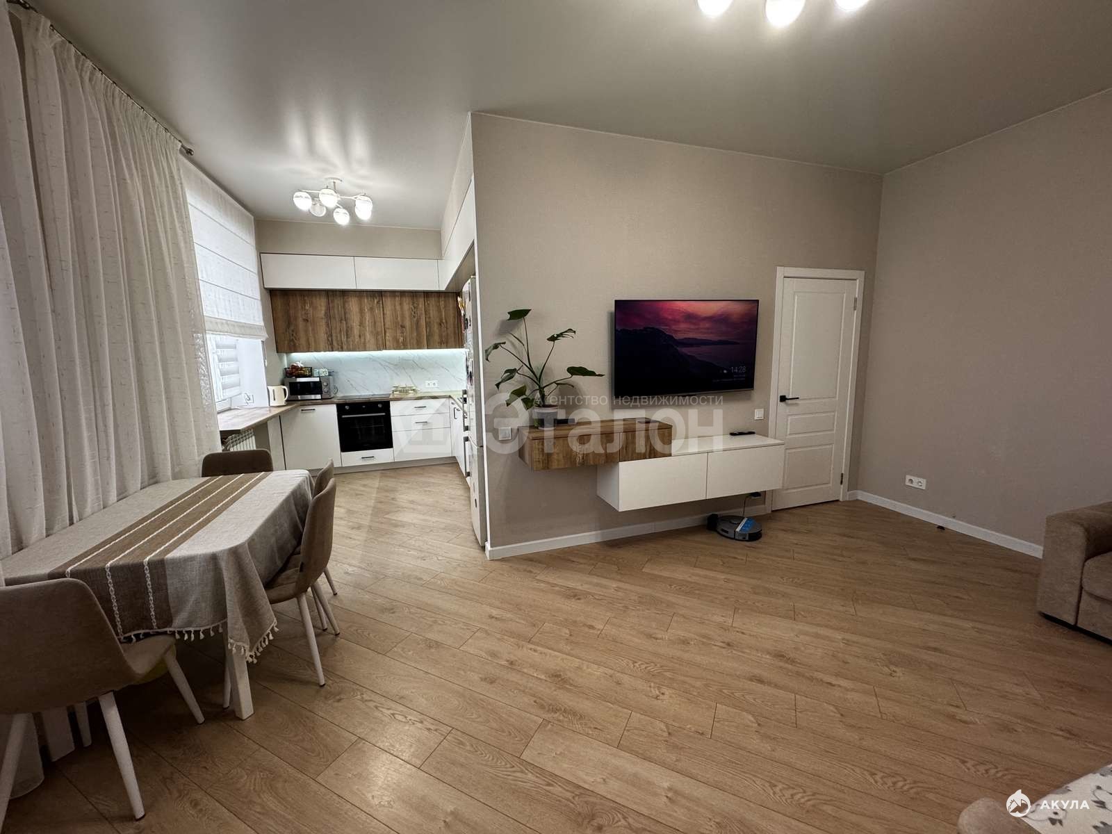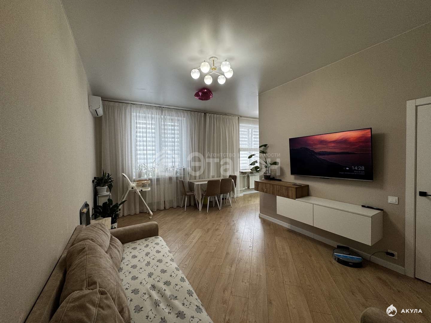 На стенах флизилиновые обои, натяжной потолок, на полу влагостойкий ламинат. Ванная комната облицована плиткой, установлена качественная сантехника, электрический теплый пол, также оборудована постирочная со встроенными шкафами. Оборудованная большая кухня с гарнитуром из качественных материалов. Установлены: индукционная варочная панель, духовой шкаф, посудомоечная машина, вытяжка - это будет бонусом для покупателя. Две сплитсистемы в спальне и кухне-гостиной.