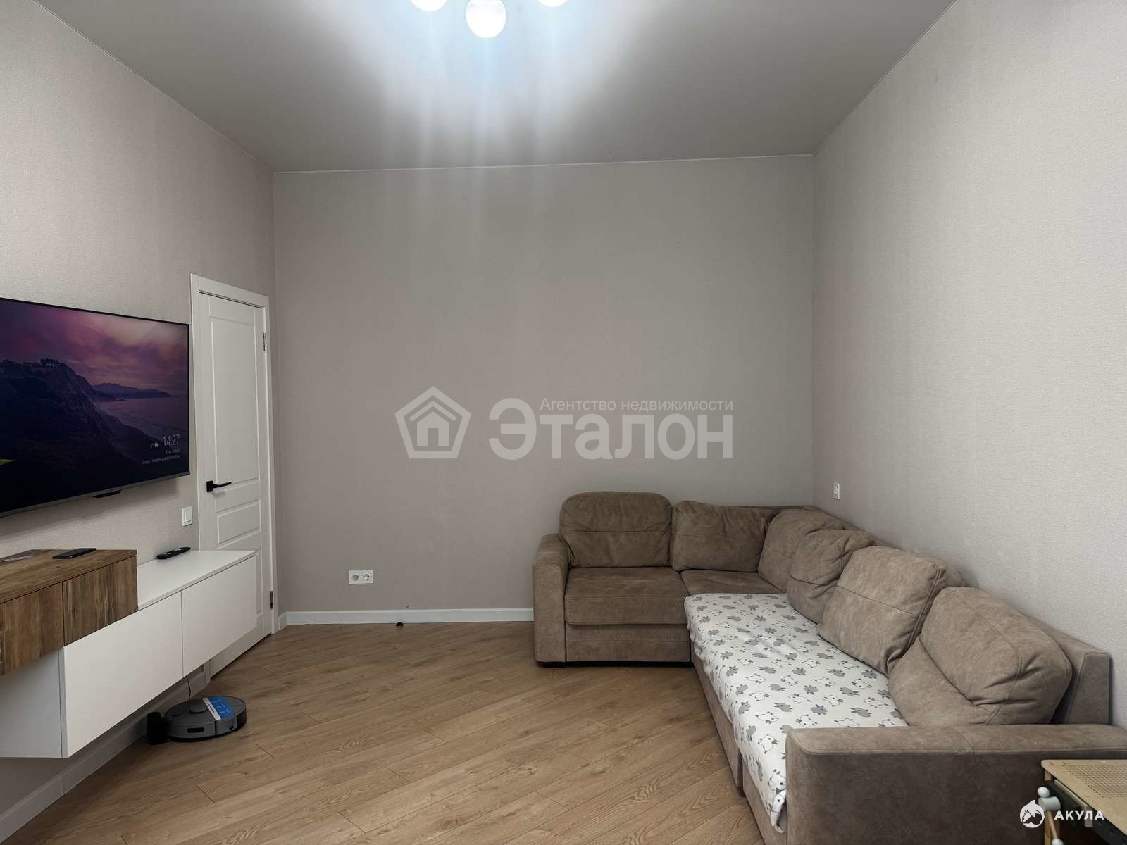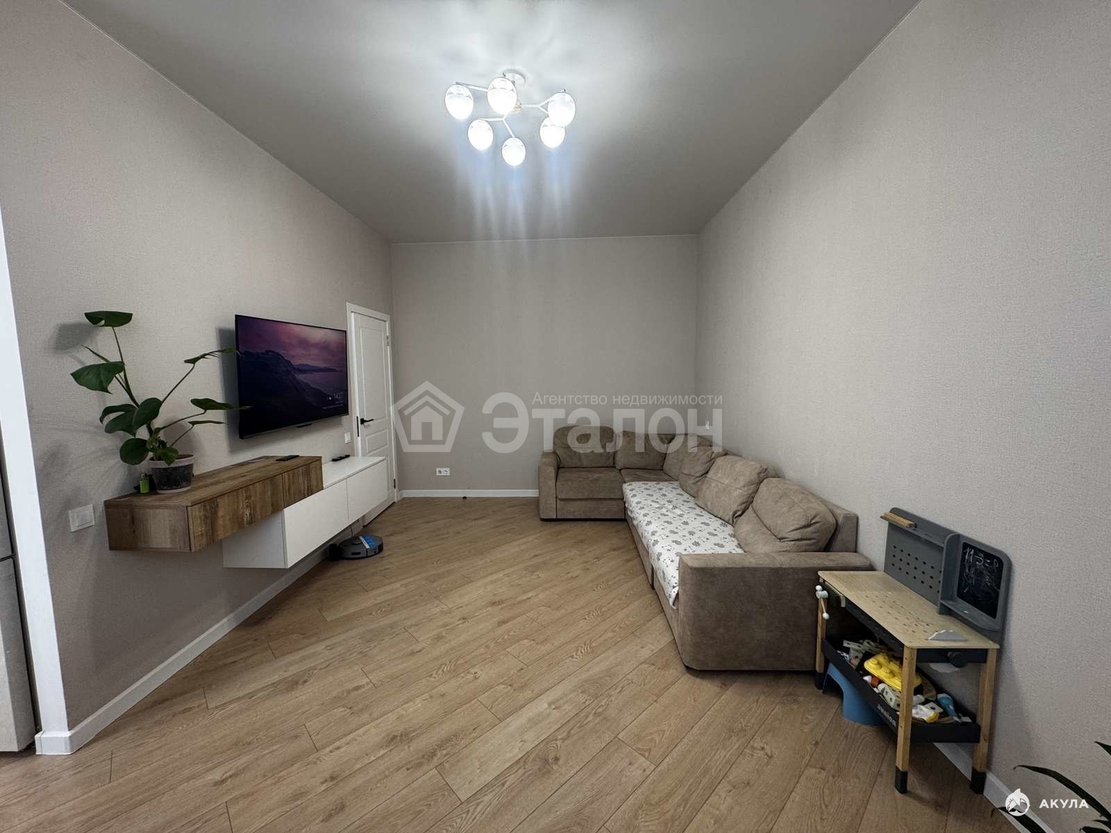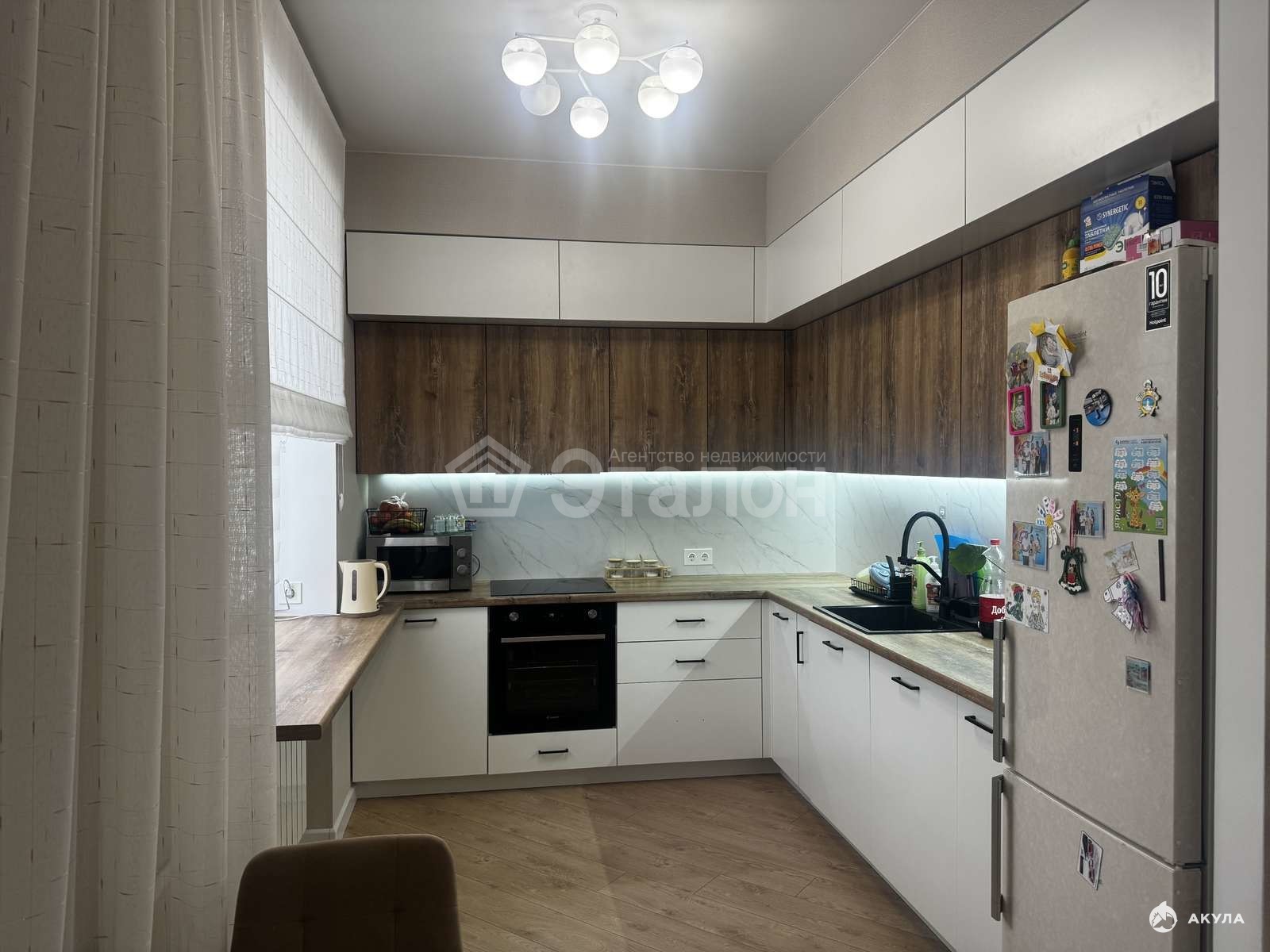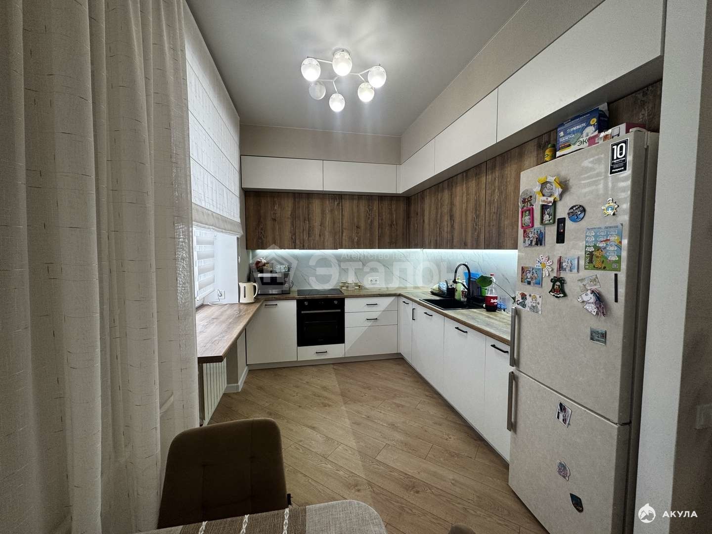 На стенах флизилиновые обои, натяжной потолок, на полу влагостойкий ламинат. Ванная комната облицована плиткой, установлена качественная сантехника, электрический теплый пол, также оборудована постирочная со встроенными шкафами. Оборудованная большая кухня с гарнитуром из качественных материалов. Установлены: индукционная варочная панель, духовой шкаф, посудомоечная машина, вытяжка - это будет бонусом для покупателя. Две сплитсистемы в спальне и кухне-гостиной.