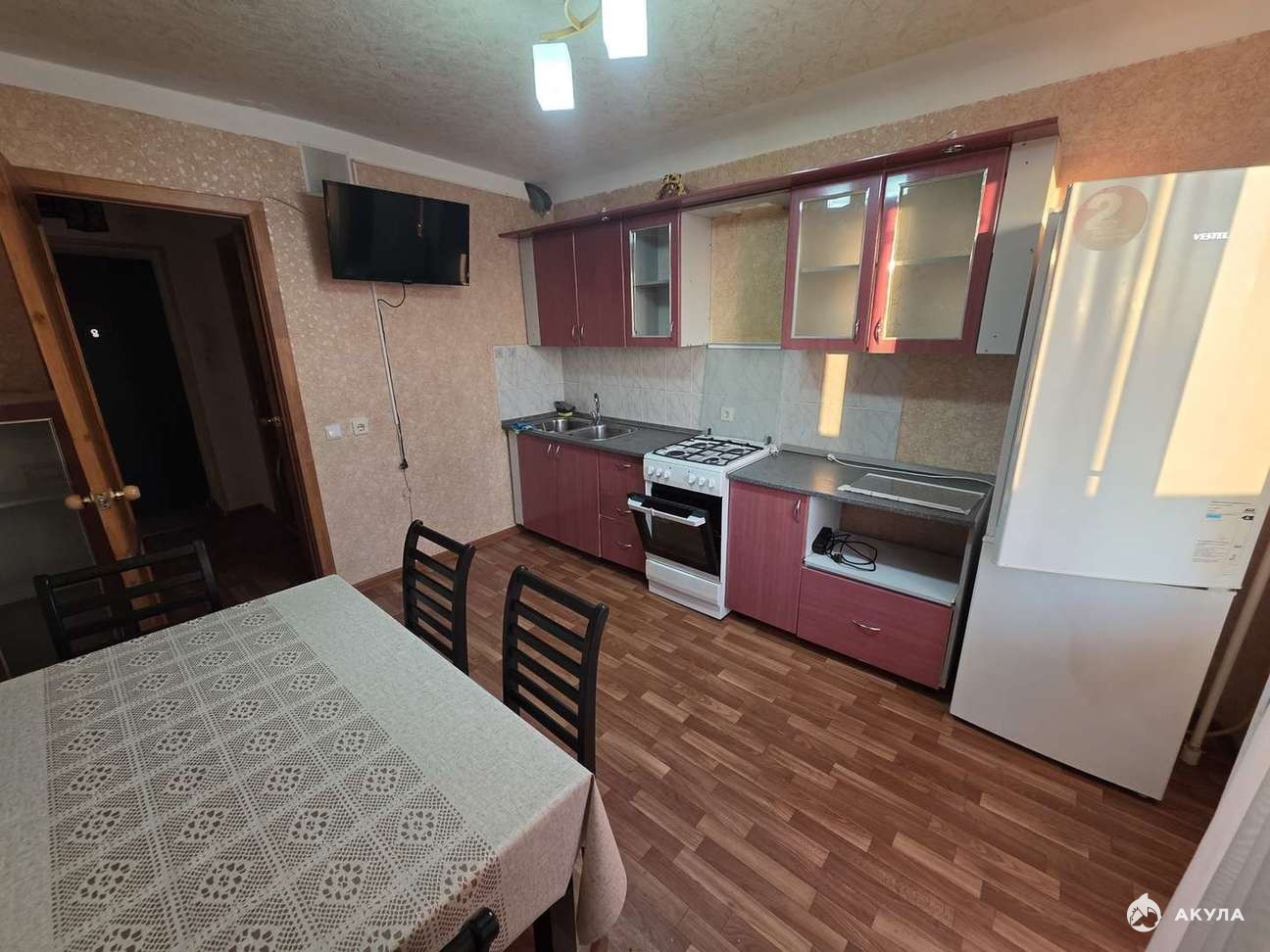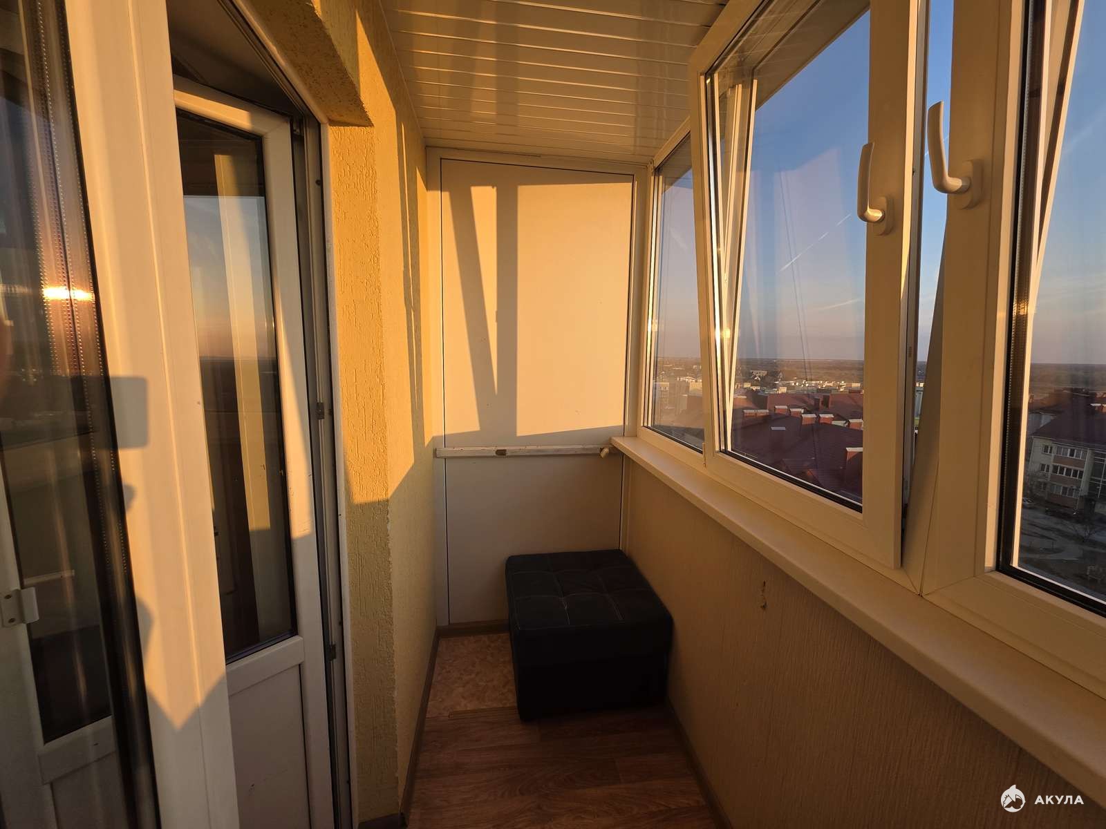 В квартире: холодильник, стиральная машина, шкаф, диван, кровать, кухонный гарнитур, застекленный балкон.
