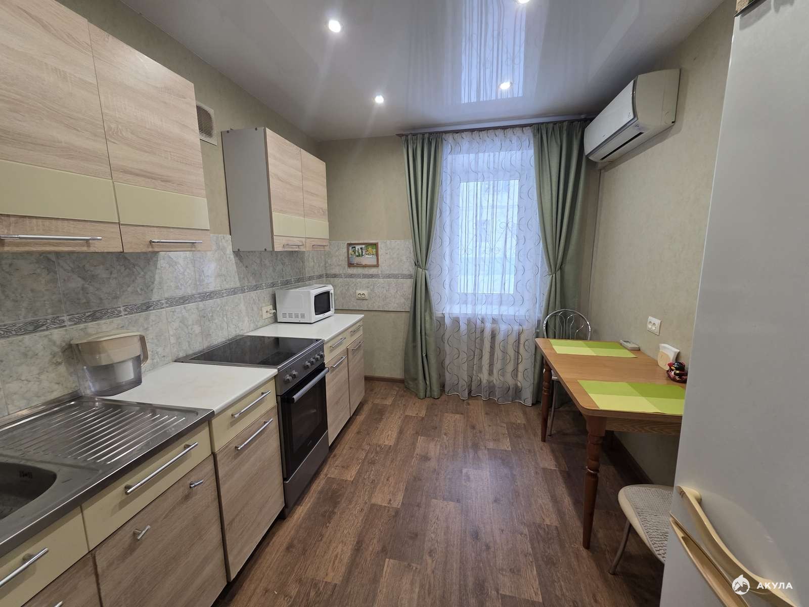 Квартира полностью укомплектована для проживания, есть все необходимое: спальные места, холодильник, стиральная машинка, кухонный гарнитур, сплитсистема.